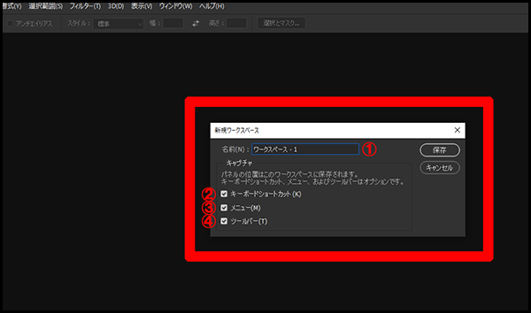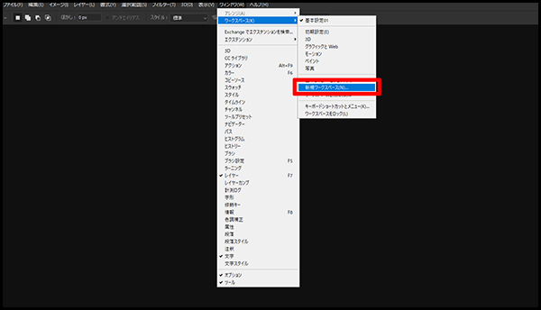 「ウィンドウ」→「ワークスペース」→「新規ワークスペース」
