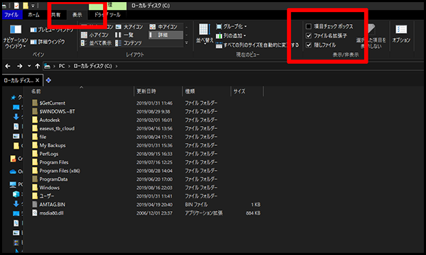左上の「表示」タブを選択